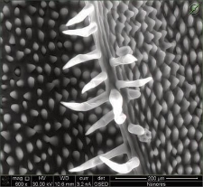 Brzeg płatka kwiatu - Przetocznika Peskiego (Veronica persica). Zdjęcie wykonano przy użyciu skaningowego mikroskopu elektronowego Quanta 3D 200i ; Praca nadesłana na 3nd Microscopic Art Non-Limited International Annual Contest MANIAC 2021 ; kliknij tutaj, żeby przejść