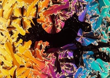 Fotografia przedstawia benzoesan cholesterylu w temperaturze pokojowej. Próbka charakteryzuje się szeroką gamą kolorów ze względu na zjawisko dwójłomności ; Praca nadesłana na 3nd Microscopic Art Non-Limited International Annual Contest MANIAC 2021 ; kliknij tutaj, żeby przejść