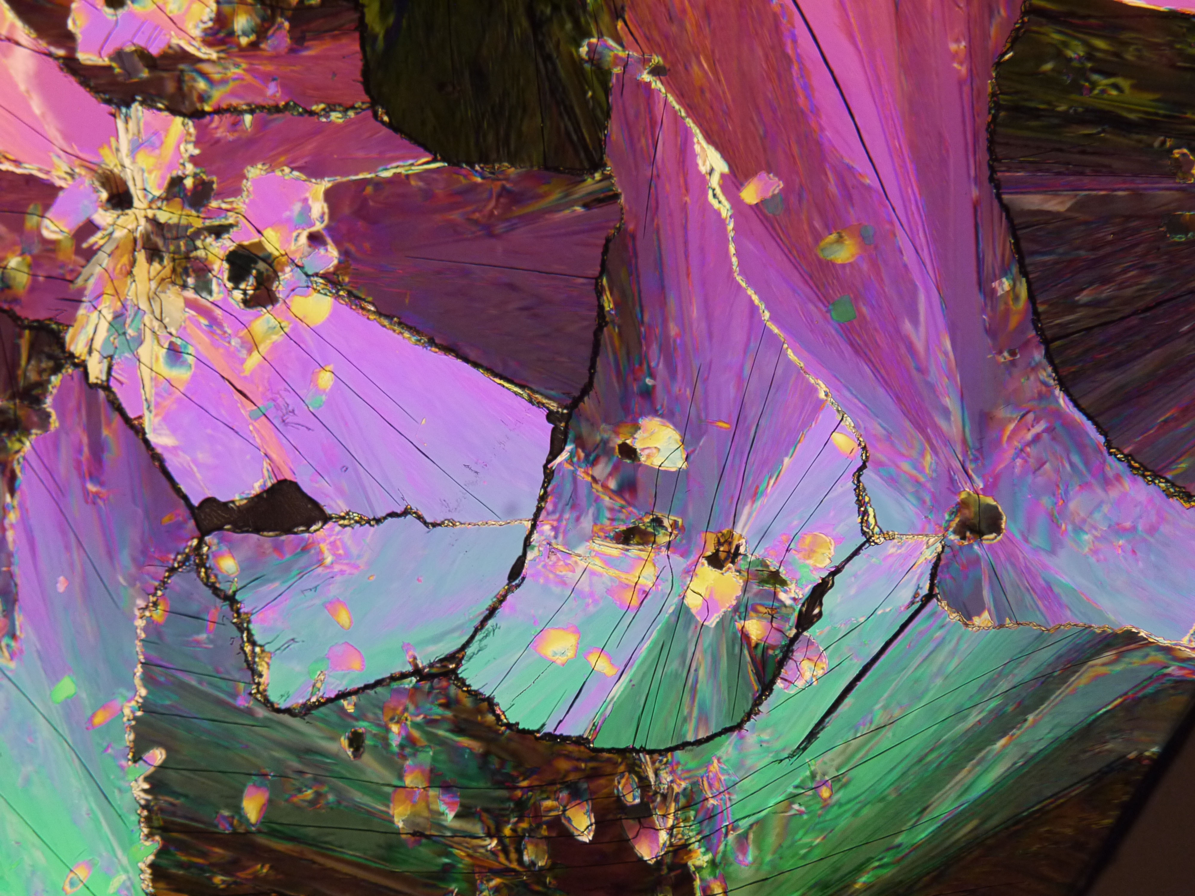 Opis:Zdjęcie przedstawia fazy krystaliczne benzoesanu cholesterylu - pierwszego opisanego materiału ciekłokrystalicznego, którego wyjątkowe właściwości zostały zaobserwowane już w XIX wieku. Fotografię wykonano przy użyciu mikroskopu polaryzacyjnego w temperaturze pokojowej ; Praca nadesłana na 3nd Microscopic Art Non-Limited International Annual Contest MANIAC 2021 ; kliknij tutaj, żeby przejść