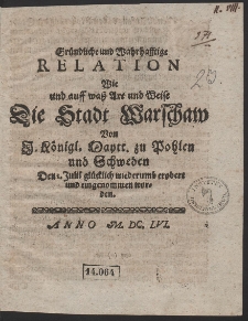 Title: Gründliche und Wahrhafftige Relation Wie und auff waß Art und Weise Die Stadt Warschaw Von I. Königl. Maytt. zu Pohlen und Schweden Den 1. Julii glücklich wiederumb erobert und eingenommen worden