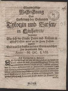 Glaubwürdige Nachrichtung Von Eroberung der Vestungen Tykoczin und Birsen in Lithauen, Imgleichen Wie sich die Stadt Posen und Koscian in Grosspolen wieder an die Cronn Polen ergeben, Und was sich sonsten anderer Orten neuerlicher Zeit zugetragen hat