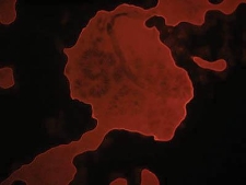 Zdjęcie zostało wykonane przy użyciu mikroskopu polaryzacyjnego. Przedstawia emitujące na czerwono nanokryształy Zn-Ag-In-S zdyspergowane w chloroformie ; Praca nadesłana na 3nd Microscopic Art Non-Limited International Annual Contest MANIAC 2021 ; click here to follow the link