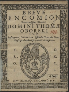 Tytuł i tekst w ozdobnych ramkach typograficznych z postaciami świętych ; Drzeworytowe herby Roch (Pierzchała) Oborskich na stronie tytułowej i na verso karty sygnowanej B1, na stronie tytułowej herb w otoczeniu inicjałów: T. O. S. C. O. C. E. L. [to jest: Thomas Oborski Suffraganus Canonicus Officialis Cracoviensis Episcopus Laodicensis] ; Z wiedeńskiego księgozbioru Józefa Maksymiliana Ossolińskiego