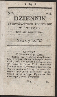 | Dziennik Patryotycznych Politykow w Lwowie. R. 1794 Nr 104 | 14 paź 2024 |