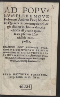 Publikacja dofinansowana w ramach projektu "System upowszechniania piśmienniczych zbiorów specjalnych OSSOLINEUM we Wrocławiu poprzez digitalizację i publikację internetową jako promocja i popularyzacja dziedzictwa kulturowego" ; Ad Populum Plebemque Polonam Andreae Fricii Modrevii Querela de contemptione Legis divinae in homicidas, cui adiu[n]cta est oratio quarta ex psalmis Davidicis composita. Praefixe Sunt Epistolae Duae, Altera ad Sigismundum Primum patrem, altera ad Sigismundum Secundum Augustum filium, reges Poloniae inclytos, Lithuaniae magnos Duces, Russiae, Prussiae, Mazoviaeq[ue] dominos […]